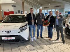 Im Namen aller Werberingmitglieder gratulierten unsere Vorstandsmitglieder Rafael Görtz und Axel Holl dem Gewinner des letztjährigen Weihnachtsgewinnspiels Dieter Melcher. Gemeinsam mit Fabian Paes vom Autohaus Schumacher Zwei übergaben sie offiziell die Schlüssel des Hauptpreises, einem Toyota Aygo X.